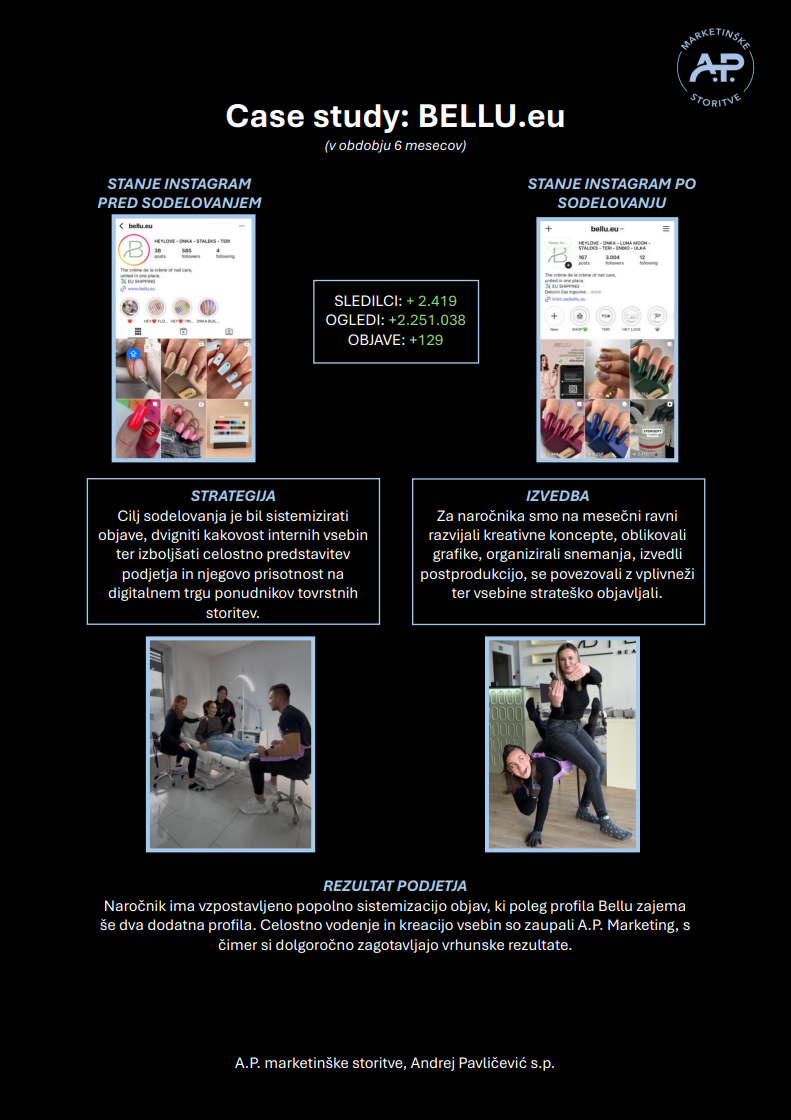 Cilj sodelovanja je bil preobraziti profil v bolj estetsko dovršen in uporabniku prijazen vizualni pristop, vzpostaviti sistematičen ritem objav, grafično poudarjati novosti ter zagotavljati dosledne in vsebinsko usklajene story objave.
