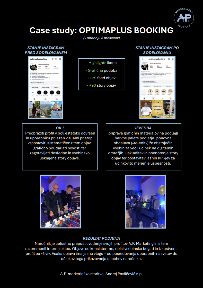 Želeli smo se aktivno vključiti na TikTok, vendar smo ugotovili, da je generiranje vsebine izjemno zahtevno in časovno potratno. Agencija A.P. marketing je v celoti prevzela to nalogo in poskrbela za profesionalno ustvarjanje in upravljanje naših objav na TikToku.